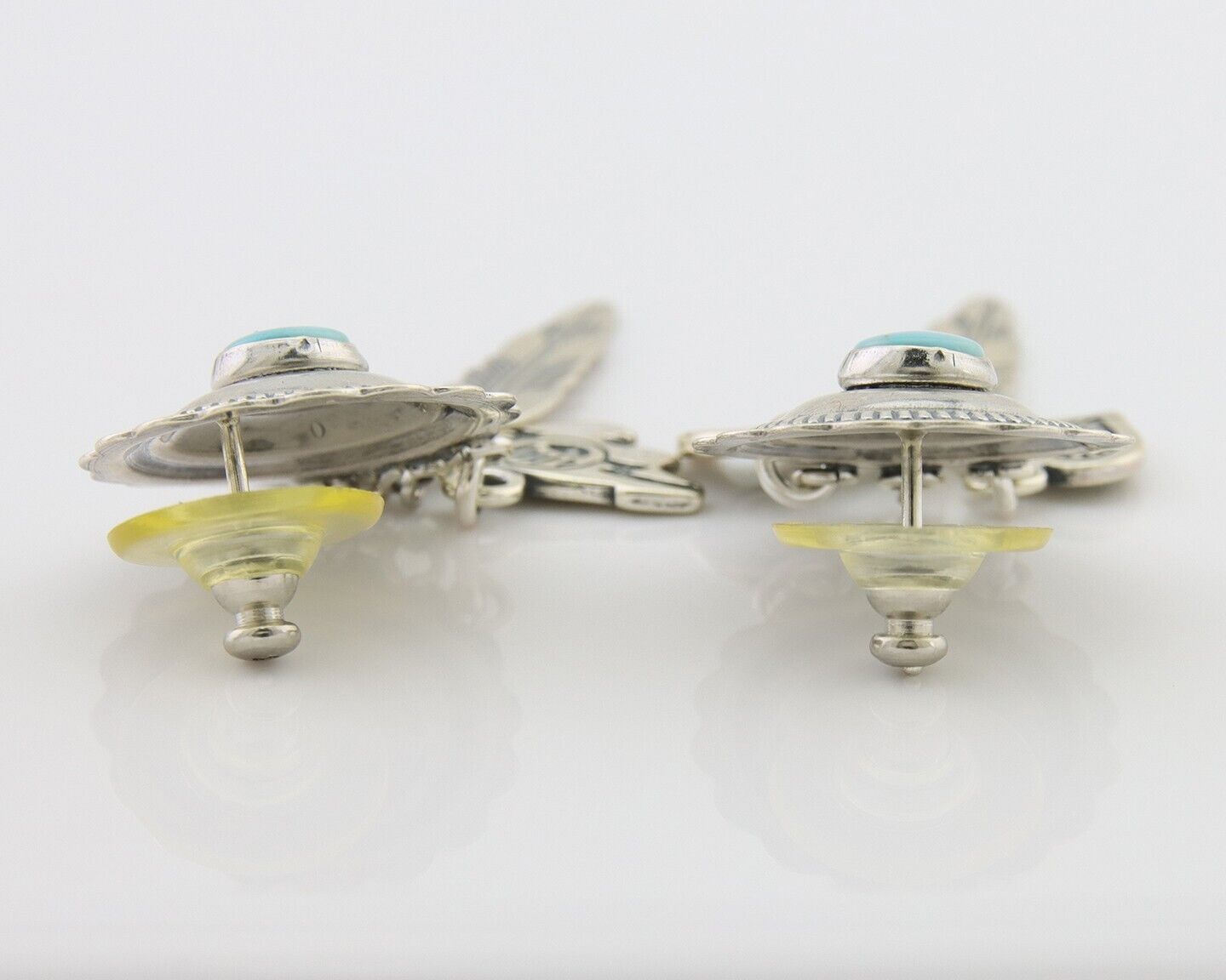 Navajo Concho Dangle Bear Feather Heart Earrings 925 Silver Natural Turquoise