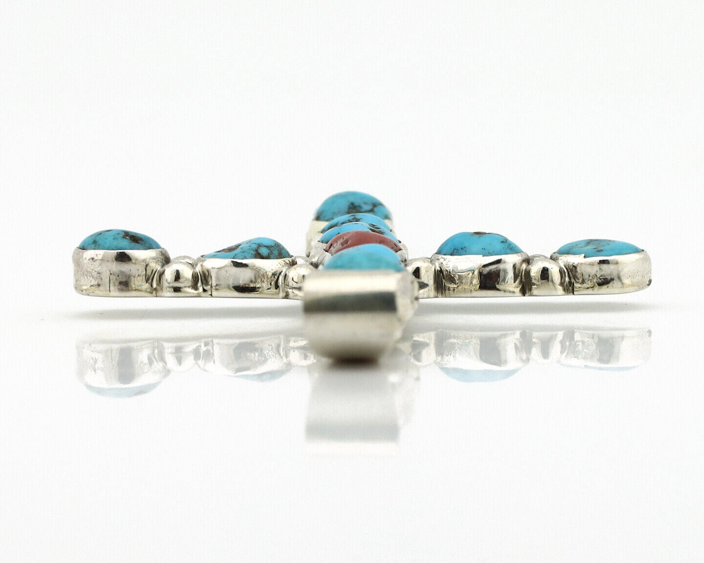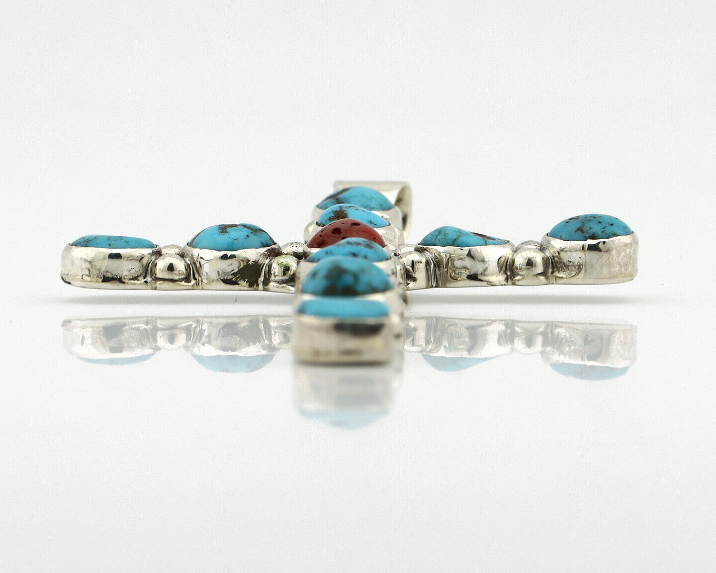 Zuni Handmade Cross Necklace 925 Silver Coral & Turquiose Artist Signed JWJ C80s