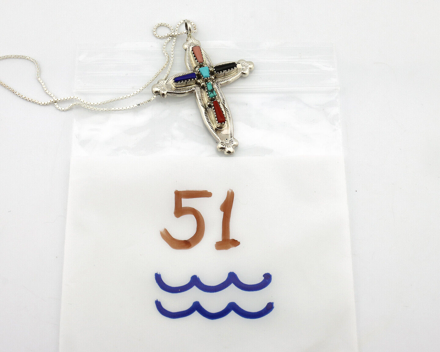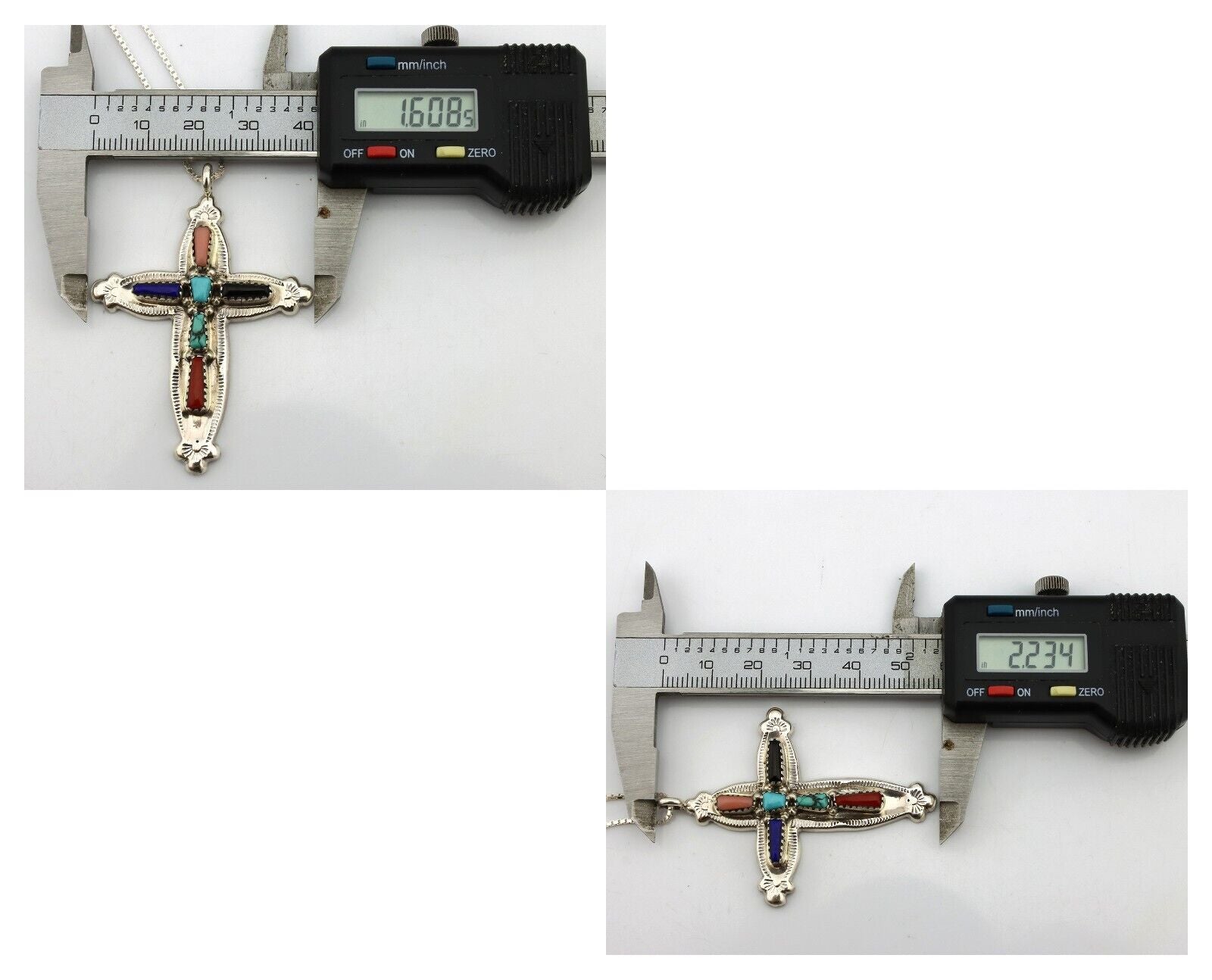 Zuni Handmade Cross Necklace 925 Silver Natural Gemstone Signed E Kaskalla C.80s