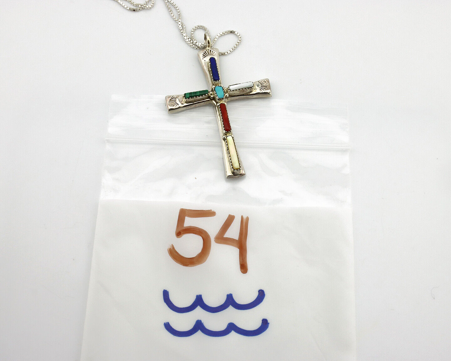 Zuni Handmade Cross Necklace 925 Silver Natural Gemstone Signed L. IULE C.80's